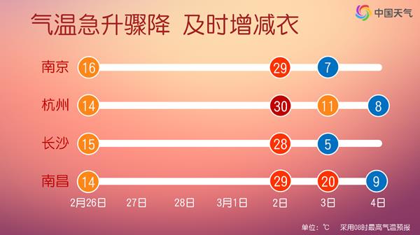 在升温過程中偏暖突出的江淮、江南等地降温最為猛烈,3月2日至3日單日降温幅度或達20℃左右,一天之內穿越兩個季節。像南京3月2日至3日最高氣温從29℃降至7℃,長沙從28℃降至5℃,杭州從30℃降至11℃,體驗過山車式升降温。