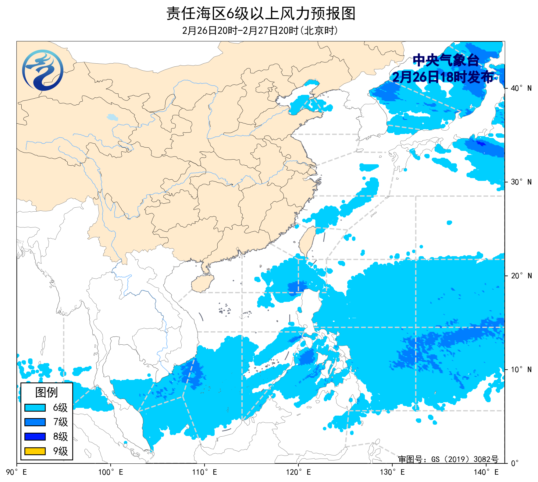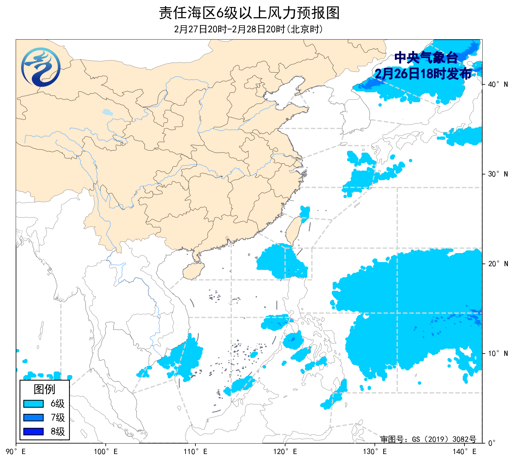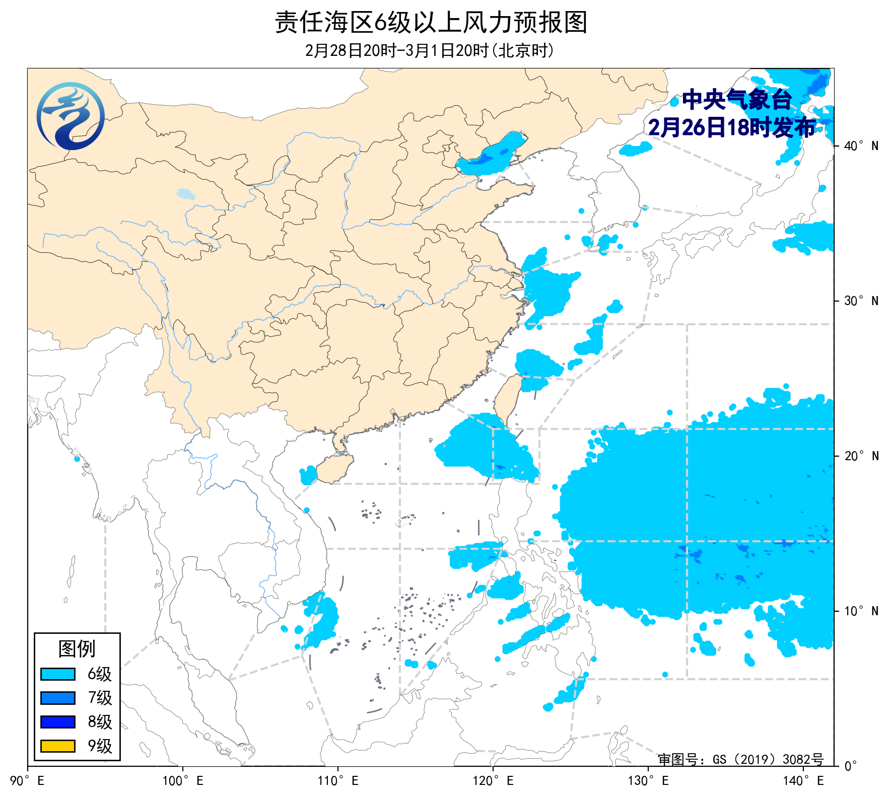 3月2日白天至5日白天,受温帶氣旋和冷空氣共同影響,渤海、渤海海峽、黃海大部海域、東海大部海域、台灣海峽、台灣以東洋麪、巴士海峽、南海北部海域、北部灣將先後有6~8級、陣風9級的大風,其中黃海南部、東海北部和台灣海峽的部分海域風力可達9級、陣風10~11級。