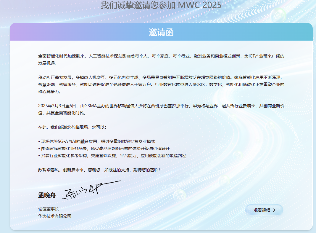 華為,作為一家通信行業的龍頭企業,每年MWC期間華為的展台面積,展品的豐富程度都是首屈一指,華為的技術創新也是通信行業尤其值得關注的重點。近日,華為輪值董事長孟晚舟也發出邀請函。她寫道:“移動AI正蓬勃發展,多模態人機交互、多元化內容生成、多場景具身智能將不斷釋放泛在超寬網絡的價值。家庭智能化應用不斷湧現,智慧終端、智家服務、智能助理將促進全光聯接進入千家萬户。行業數智化轉型進入深水區,數字化、智能化和低碳化正在重塑企業的核心競爭力。”