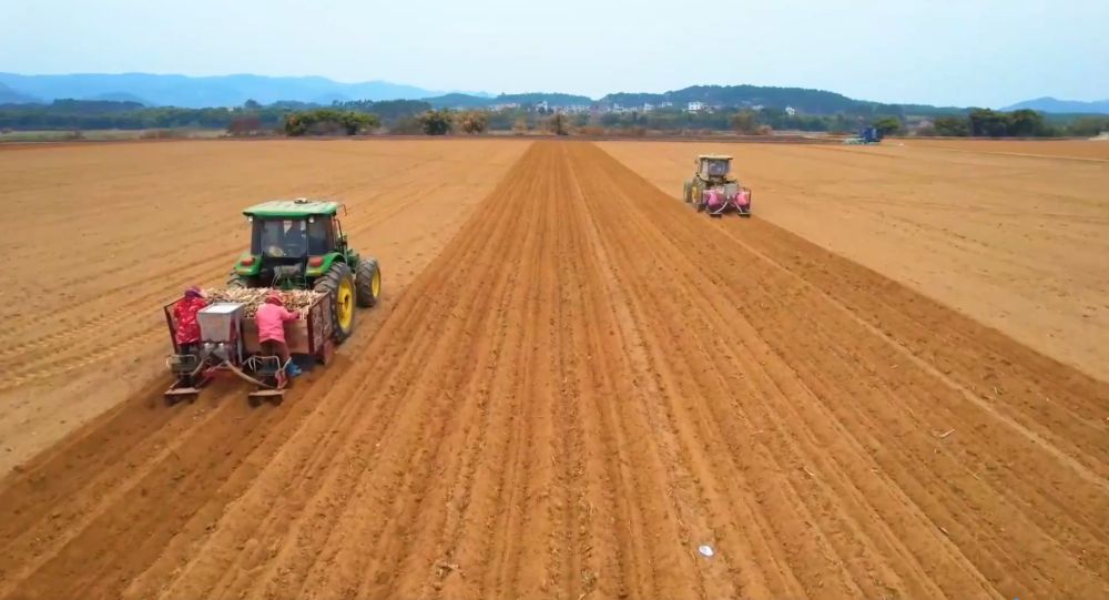 在廣西來賓市興賓區鳳凰鎮國家現代農業產業園黃安優質“雙高”糖料蔗基地,田間地頭大型拖拉機、甘蔗種植機並列同步作業,不到15分鐘,兩壟長約200米的甘蔗全部種植完畢。