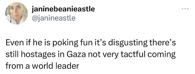“即使他在開玩笑,這也令人感到厭惡,加沙仍然有人質,作為世界(一個國家的)領導人,這種做法不太恰當”。↓