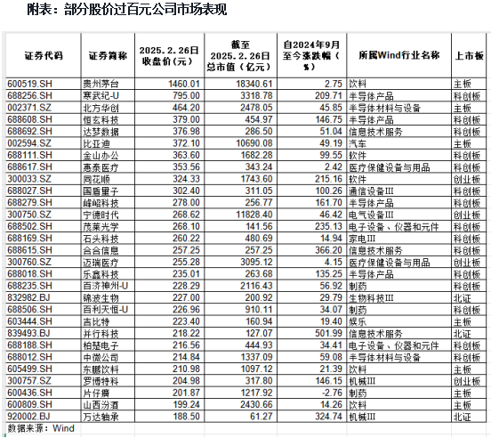 股價表現上,103只百元股中有59只自2024年9月以來累計漲幅超過50%,36只股票累計漲幅超過100%,僅有6只股票期間股價累計出現下跌。