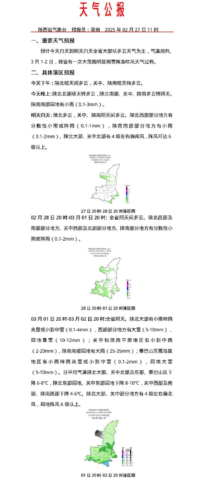 主要降水時**段為1日夜間至3日白天,陝北大部、關中西部和北部、陝南東部、秦巴山區有小到中雨轉雨夾雪或中到大雪,陝北西部及北部、秦巴山區部分地方有大到暴雪。積雪深度陝北北部、秦巴山區3~10釐米。