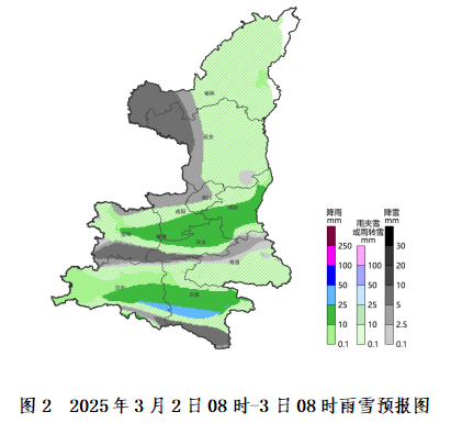 3月2日:**陝北西部、秦巴山區中到大雪(3~10毫米),部分地方有大到暴雪(8~12毫米),陝北中東部、關中北部小到中雨或雨夾雪轉中到大雪(3~10毫米),關中南部、陝南大部中雨(10~20毫米),局地大雨(25~30毫米)(圖2)。