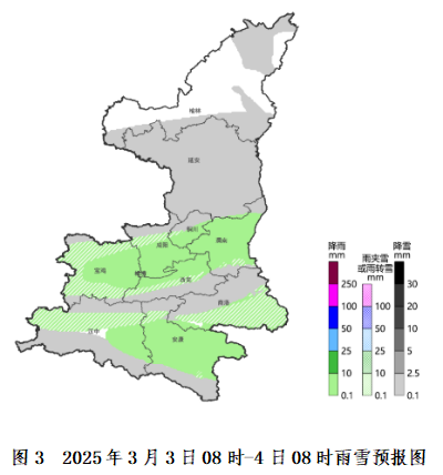 3月3日*:**陝北中南部、關中北部有分散性小雪(0~1毫米),商洛、秦巴山區有雨夾雪或小雪(0~2毫米)*,關中南部、陝南南部部分地方有小雨(0~2毫米)(圖3)。積雪深度陝北北部、秦巴山區3-10釐米,陝北南部3~5釐米,陝南東部0~5釐米。
