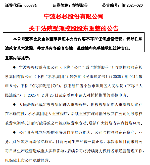 杉杉集團相關負責人表示,重整目的是通過法律程序恢復企業活力和償債能力,重整範圍僅限於集團自身債務與資產,不涉及上市公司杉杉股份。集團有信心在政府及金融機構的幫助下,有序推進重整工作。