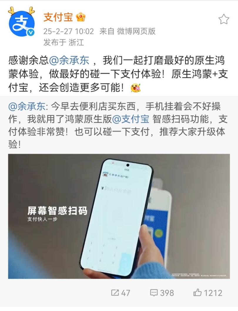 當支付工具進化為場景智慧中樞,從"人找服務"到"服務智達”,支付寶與鴻蒙的深度協同正在打開數字生活的無限可能。快來【我的華為APP】點擊【升級嚐鮮】即刻升級原生鴻蒙,體驗鴻蒙原生版支付寶,開啓智慧生活加速度。(趙華)