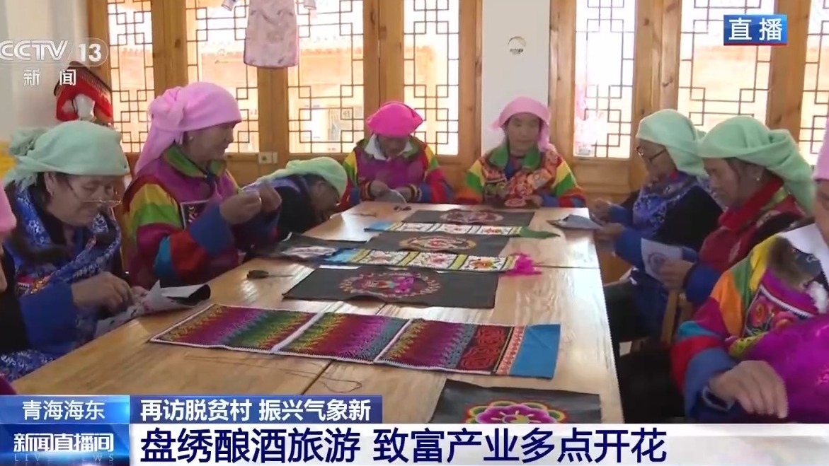 十幾位繡娘正忙着趕製這兩天接到的土族盤繡訂單,這些訂單來自全國多地。土族盤繡是當地一門民間傳統刺繡藝術,也是國家級非物質文化遺產。