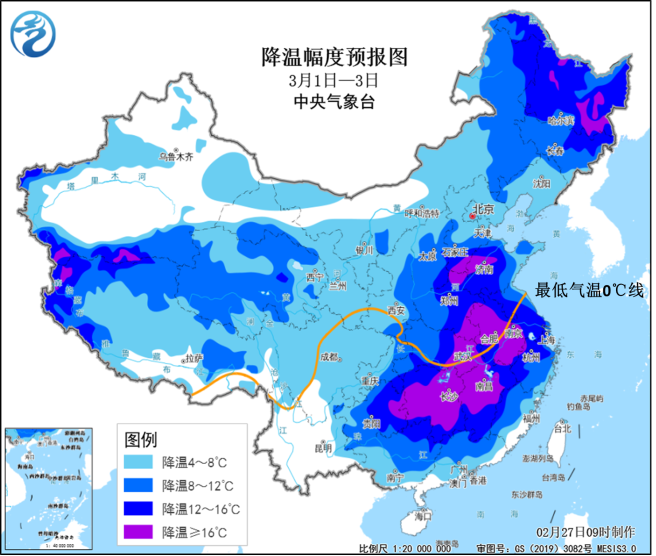 中央氣象台:3月1日至3日寒潮將影響我國 中東部將有大範圍雨雪和大風降温天氣