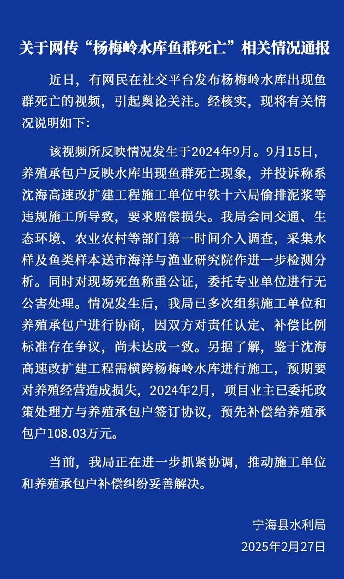 2月27日,寧海縣水利局發佈《關於網傳“楊梅嶺水庫魚羣死亡”相關情況通報》稱,經核實,*該視頻所反映情況發生於2024年9月。*9月15日,養殖承包户反映水庫出現魚羣死亡現象,並投訴稱系瀋海高速改擴建工程施工單位中鐵十六局偷排泥漿等違規施工所導致,要求賠償損失。寧海縣水利局會同交通、生態環境、農業農村等部門第一時間介入調查,採集水樣及魚類樣本送市海洋與漁業研究院作進一步檢測分析。同時對現場死魚稱重公證,委託專業單位進行無公害處理。情況發生後,寧海縣水利局已多次組織施工單位和養殖承包户進行協商,因雙方對責任認定、補償比例標準存在爭議,尚未達成一致。另據瞭解,鑑於瀋海高速改擴建工程需橫跨楊梅嶺水庫進行施工,預期要對養殖經營造成損失,2024年2月,項目業主已委託政策處理方與養殖承包户簽訂協議,預先補償給養殖承包户108.03萬元。當前,寧海縣水利局正在進一步抓緊協調,推動施工單位和養殖承包户補償糾紛妥善解決。