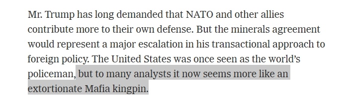 《紐約時報》更是形容,美國現在更像是敲詐勒索的黑手黨頭目。美烏礦產協議,“讓人想起了殖民大國向殖民地索要貢品的情景”。