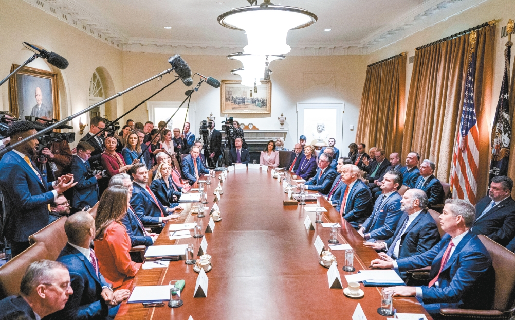【環球時報駐美國特約記者 蕭達 王逸】當地時間26日,美國總統特朗普舉行其第二任期的首次內閣會議。他在會議上對歐洲盟友進行新一輪猛烈抨擊,聲稱“歐盟成立就是為了搞砸美國”,並威脅要對歐盟加徵25%的關税。在烏克蘭問題上,特朗普拒絕為烏克蘭提供安全保障,並稱烏克蘭的安全應由歐洲來承擔。面對美國的全面威脅和打壓,歐盟一方面表示將對美方加税進行報復,另一方面,歐盟領導人也緊急出動:歐盟委員會主席馮德萊恩27日率團訪問印度,希望加強與印度的經濟聯繫。英國首相斯塔默27日飛往美國,寄希望於勸説特朗普在烏克蘭和關税問題上“回心轉意”,但多數分析認為希望渺茫。在特朗普的壓力下,歐洲多國領導人紛紛表示要“團結自強”,“擺脱對美國的依賴”。剛贏得德國選舉的基民盟領導人默茨26日趕赴巴黎與法國總統馬克龍會談。歐盟各國領導人週日還將在倫敦舉行歐洲共同防務峯會。《歐洲時報》稱,美歐之間自二戰以來的堅固盟友關係,已經土崩瓦解。從特朗普到副總統萬斯,從美國防長到國務卿,在不同公開場合,毫不客氣地分別給歐洲上了政治、經濟、“幫規”與意識形態課程。凡此種種,都讓歐洲領導人感到前所未有的寒意。