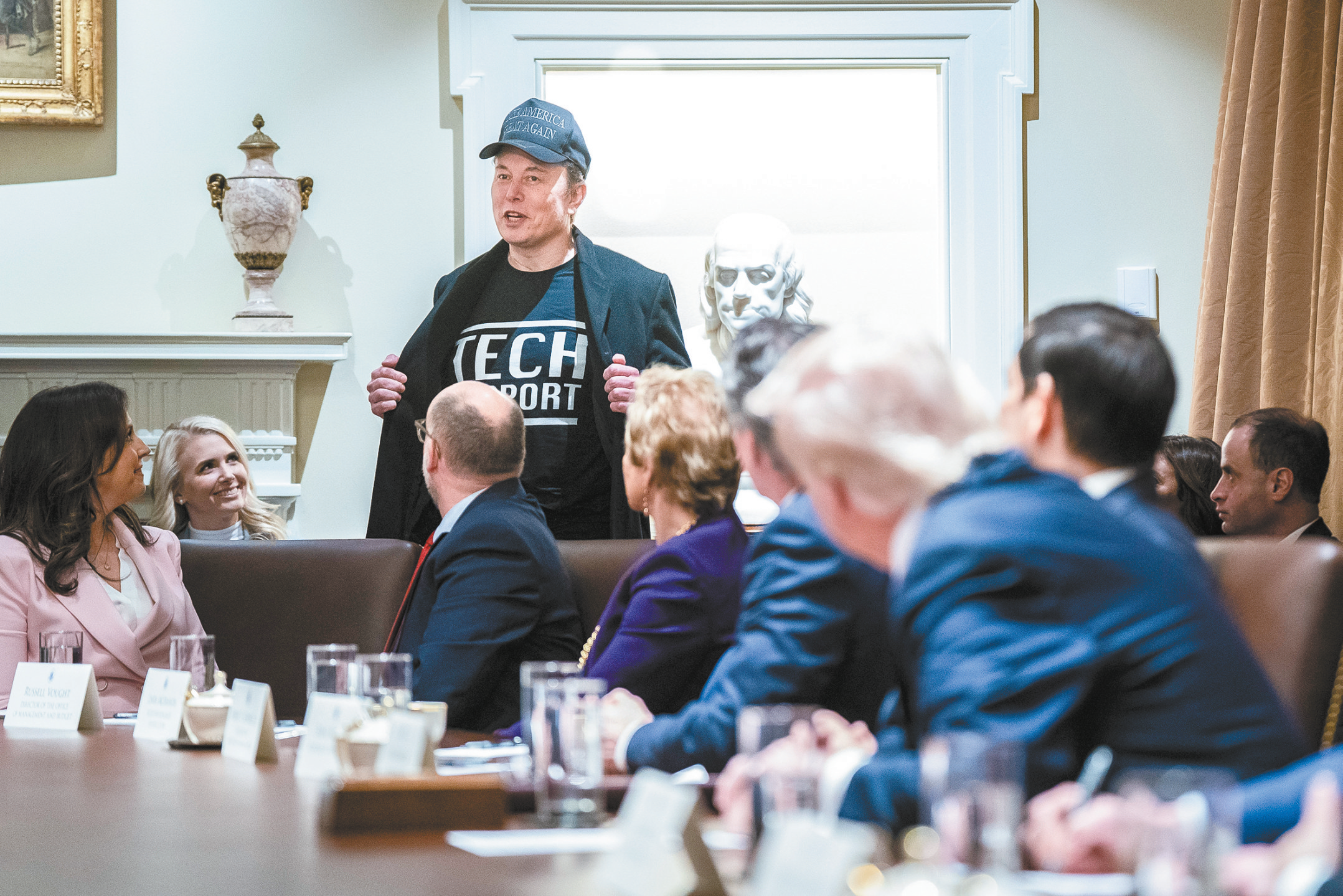 《紐約時報》稱,這是特朗普開啓第二個總統任期後首次召開內閣會議。馬斯克雖然並非內閣正式成員,但他參加了會議。和其他人西裝革履不同,馬斯克戴着“讓美國再次偉大”的棒球帽,穿着自稱(為政府提供)“卑微的技術支持”的T恤衫。“起初,馬斯克的地位似乎被降級,他沒有得到桌子旁的實際座位,而是坐在後排的椅子上,與其他非內閣級別的助手一起。”報道稱,但隨後,特朗普要求馬斯克第一個發言。“在會議剩下的大部分時間裏,馬斯克都站着;在整場會議上,馬斯克説的話比特朗普以外的任何人都多。”