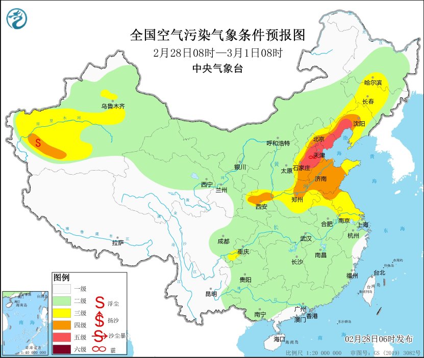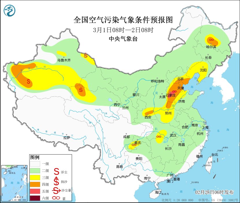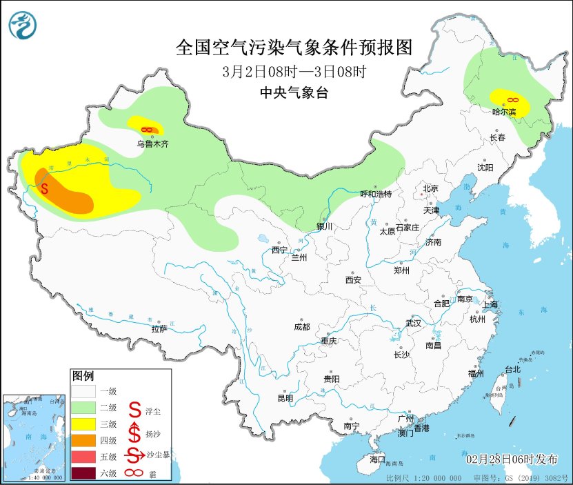 此外,2月28日至3月1日,華北中南部、黃淮大部、江淮東部、東北地區南部等地大氣擴散條件較差,部分地區有輕至中度霾,局地重度霾。2日起,受冷空氣和降水影響,上述地區大氣擴散和濕清除條件較好,無明顯霧和霾天氣。