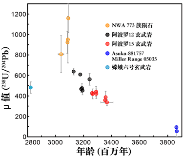 圖5 低鈦玄武岩的形成年齡與μ值的關係