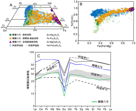 圖2 嫦娥六號玄武岩的礦物化學. (A)輝石四邊形圖。(B) 輝石Fe/(Fe+Mg) VS Ti/(Ti+Cr)圖。(C)源區稀土元素丰度配分模式圖。