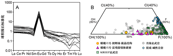 圖4 (A) 嫦娥六號斜長石REE配分模式。(B) 磷灰石F-Cl-OH三角圖。