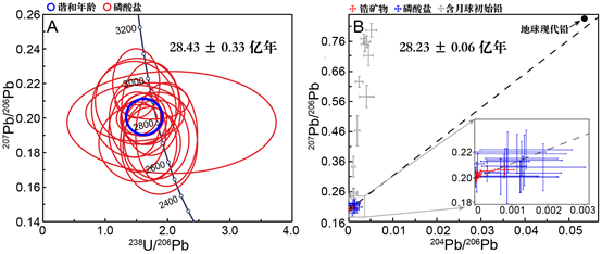 圖3 嫦娥六號玄武岩的形成年代 (A)磷酸鹽U-Pb諧和圖。(B) 鋯礦物和磷酸鹽的Pb-Pb等時線圖