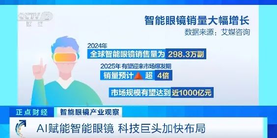 數據顯示,2024年全球智能眼鏡銷售量為298.3萬副,2025年有望迎來市場爆發期,銷量預計增長超過4倍,市場規模有望達到近1000億元。 巨大的市場增量讓包括蘋果、谷歌、華為、小米等超過40家國內外廠商佈局智能眼鏡 ,產品數量預計超過50款。