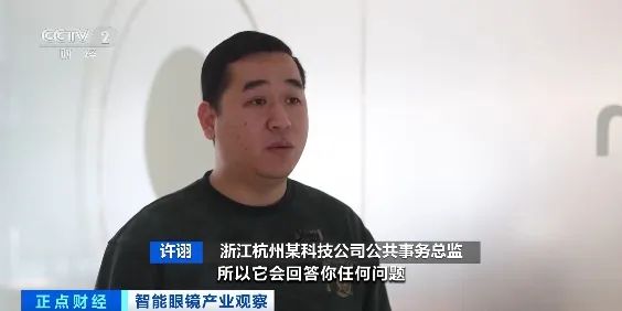 浙江杭州某科技公司公共事務總監 許詡: 因為(智能眼鏡)接了(AI)大模型,所以它會回答你問題,如果對面一個外國人講外語,我鏡片裏面顯示的就是漢字, 現在(智能)眼鏡每年出貨大概在10萬台這個量級,平均年複合增長率(為)120%。
