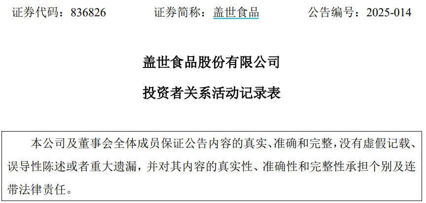 【環球網財經綜合報道】2月28日,北交所上市公司蓋世食品(836826.BJ)發佈了《投資者關係活動記錄表》,披露公司接待了華源證券、中信建投基金、諾安基金等數十家機構調研,公司董事會秘書楊懿參與並解答投資機構代表提問。