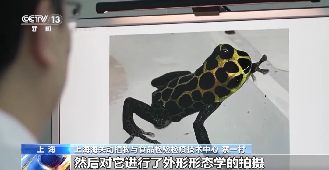上海海關動植物與食品檢驗檢疫技術中心 蔡一村 :穿戴好所有的裝備之後,對它進行了形態學的拍攝,通過它的紋路在網上查找資料,最後確定它是箭毒蛙。