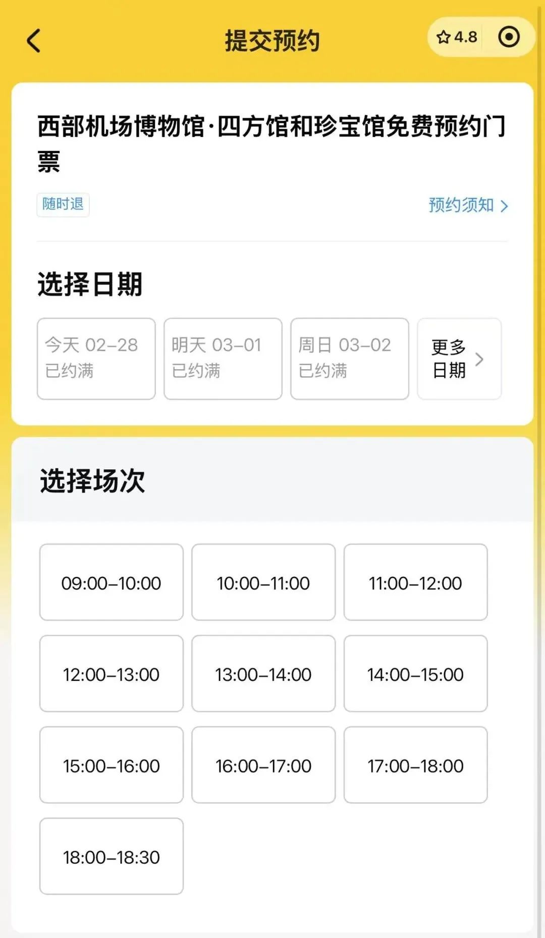 小編通過預約窗口看到,頁面顯示2月28日至3月2日已約滿。 據介紹,西部機場博物館(四方館和珍寶館)開放時間內每小時為一場次,每場結束後下一場遊客進館參觀,每場次瞬時最高承載量為60人/次。為確保文物安全,未通過線上預約渠道的遊客將按照每場次最高承載量依次排隊入場。