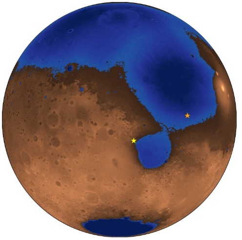 △火星36億年前的假想圖。藍色區域顯示了現已消失的Deuteronilus古海洋和海岸線。橙色星標表示中國祝融號火星車的着陸點,黃色星標是NASA毅力號火星車的着陸點(圖片來源: Robert Citron)