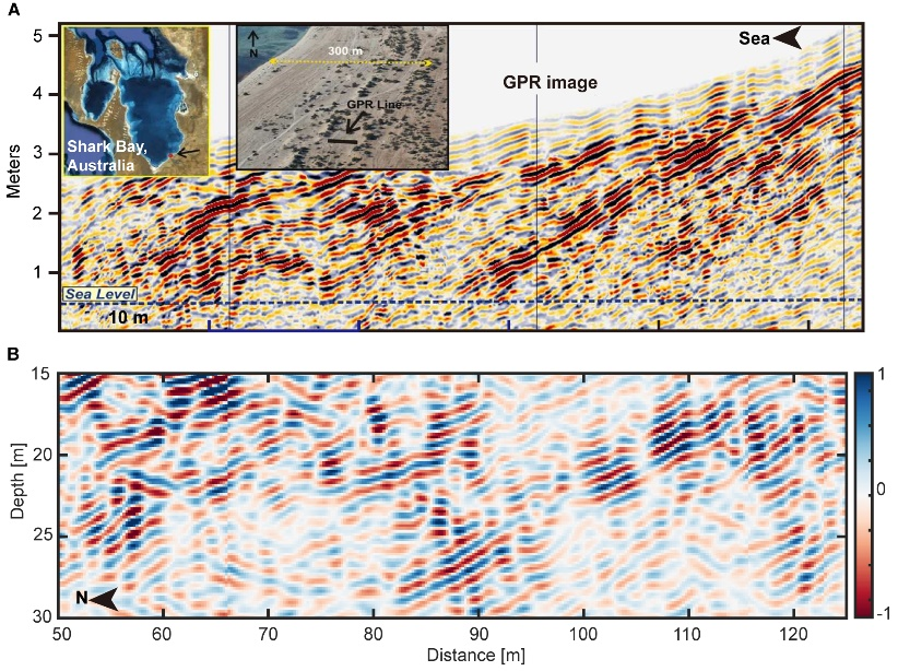△火星上探測到的傾斜反射與地球海洋沉積物的對比 (A) 澳大利亞Shark Bay濱海沉積物的探地雷達圖像;(B) 祝融號火星次表層穿透雷達低頻通道雷達剖面圖