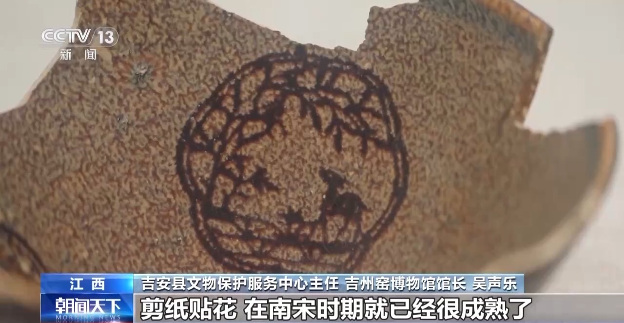 *吉安縣文物保護服務中心主任、吉州窯博物館館長 吳聲樂:*這是1981年在吉州窯肖家嶺遺址出土的晚唐吉州窯青瓷碗,它的出土表明在晚唐時代吉州窯就已經在規模化燒製瓷器。南宋的釉上貼花鹿樹紋盞,表明我們吉州窯的代表性陶瓷燒製技藝,剪紙貼花,在南宋時期就已經很成熟了。
