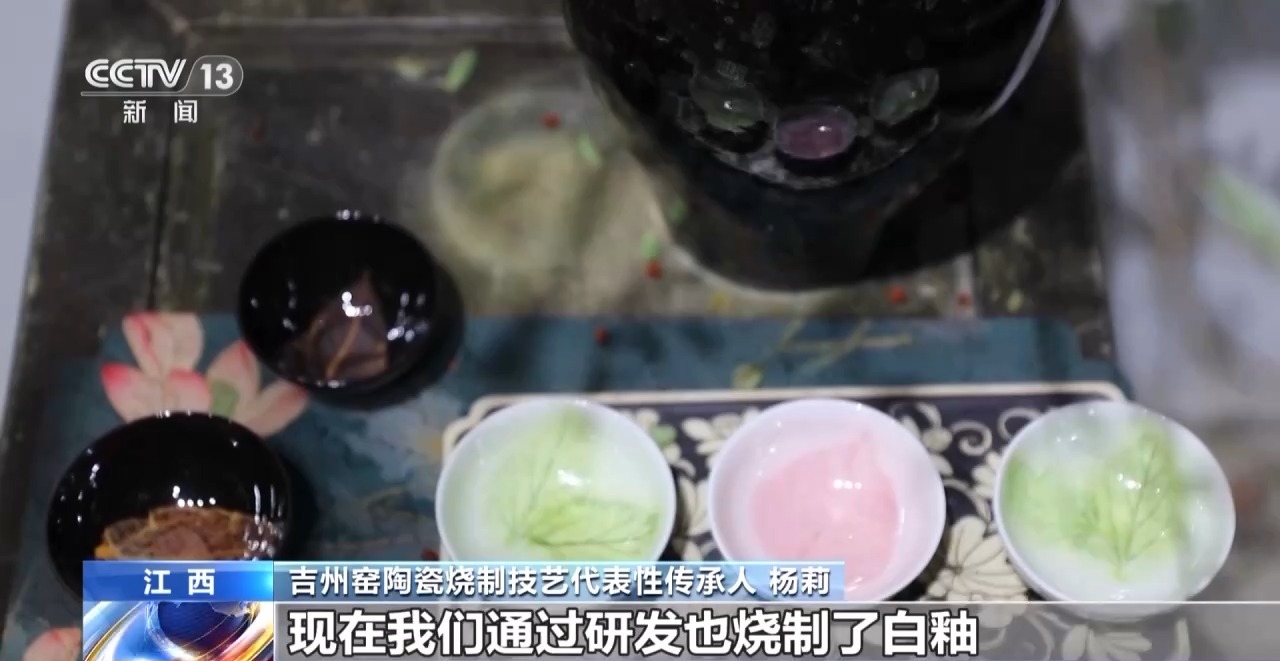 *吉州窯陶瓷燒製技藝代表性傳承人 楊莉:*這幾年我們通過研發,燒製了很多新的葉子作品,菩提葉、楊樹葉、榆樹葉等30多種葉子。傳統的木葉盞都是黑釉瓷,現在我們通過研發也燒製了白釉,讓木葉盞的品種更多樣化、更現代化。