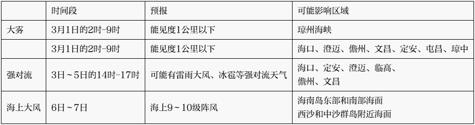*海洋方面,3月1日~5日,*北部灣海面和海南島西部海面,風力5~6級、陣風7級;瓊州海峽、海南島東部和南部海面、西沙、中沙和南沙羣島附近海面,風力5級、陣風6~7級。其中,1日早晨瓊州海峽有霧;3日~5日,瓊州海峽有雷陣雨,雷雨時陣風7~8級。