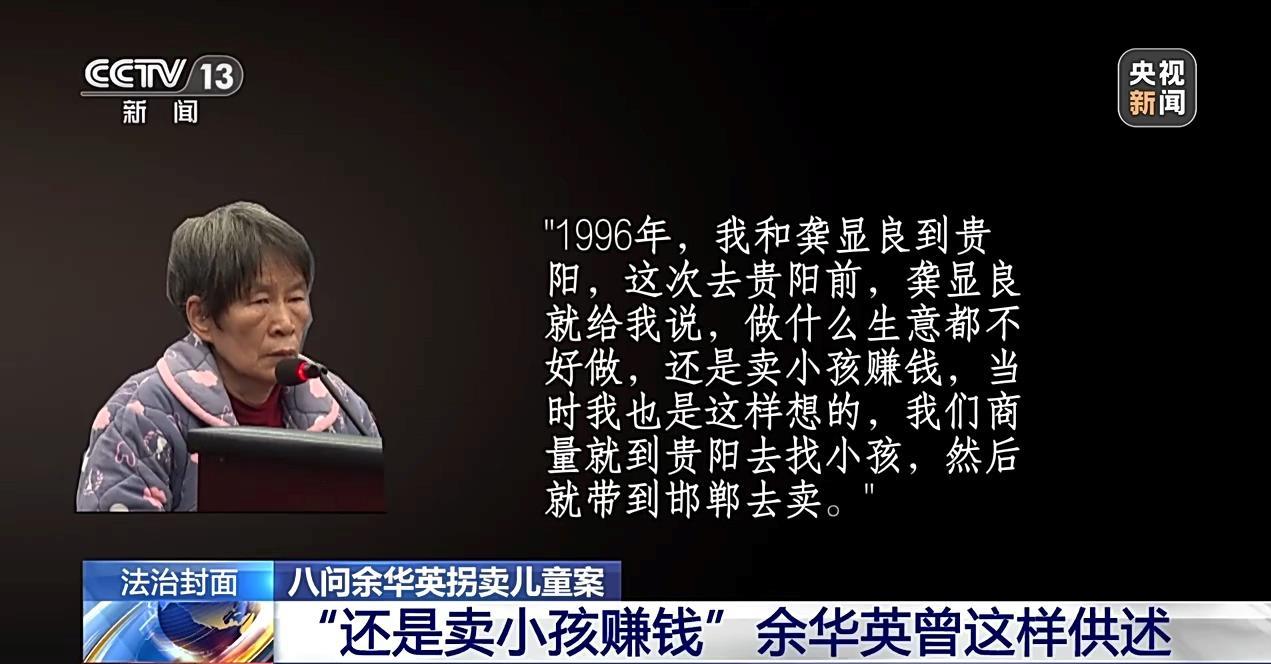 從此,餘華英就走上了一條罪惡之路,犯案多起,不知停手。餘華英供述中還有這樣一段描述,1996年,我和龔顯良到貴陽,這次去貴陽前,龔顯良就給我説,做什麼生意都不好做,還是賣小孩賺錢,當時我也是這樣想的,我們商量就到貴陽去找小孩,然後就帶到邯鄲去賣。