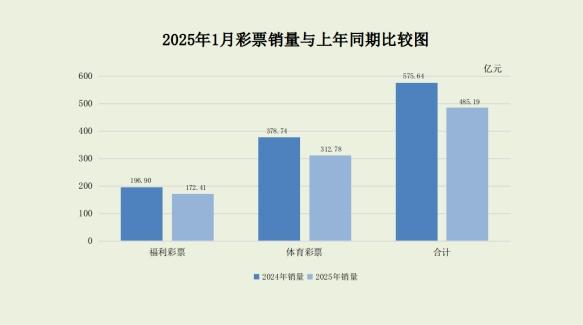 1月份,全國共銷售彩票485.19億元,同比減少90.45億元,下降15.7%。其中,福利彩票機構銷售172.41億元,同比減少24.49億元,下降12.4%;體育彩票機構銷售312.78億元,同比減少65.96億元,下降17.4%。主要是受今年1月份春節假期彩票市場休市因素影響。