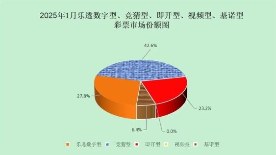 1月份,樂透數字型彩票銷售134.90億元,同比減少30.93億元,下降18.7%;競猜型彩票銷售206.63億元,同比減少25.80億元,下降11.1%;即開型彩票銷售112.82億元,同比減少27.76億元,下降19.7%;基諾型彩票銷售30.83億元,同比減少5.96億元,下降16.2%。1月份,樂透數字型、競猜型、即開型、基諾型彩票銷售量分別佔彩票銷售總量的27.8%、42.6%、23.2%、6.4%,視頻型彩票銷售0.0016億元,同比增加0.0005億元。