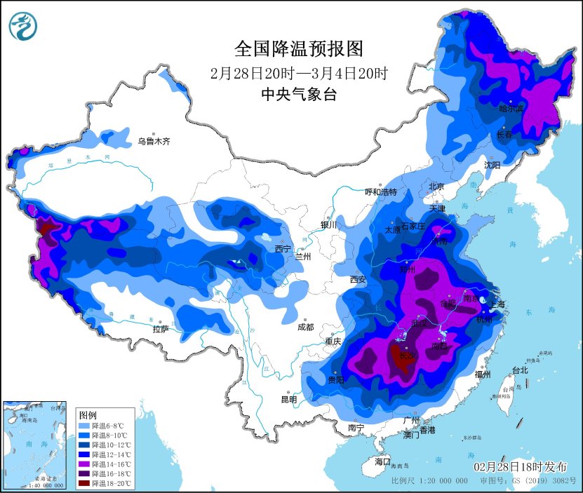 受寒潮影響,預計,2月28日夜間至3月4日,我國中東部氣温將自北向南先後下降6~10℃,其中,東北地區北部、華北南部及其以南的大部地區降温12~16℃,部分地區降温18℃以上(見圖1);4日早晨,最低氣温0℃線將南壓到江漢至沿淮河一帶(見圖2)。青藏高原北部和西部有6~10℃的降温,崑崙山部分地區降温12~14℃,局地降温16℃以上。中央氣象台2月28日18時發佈寒潮藍色預警*。*此外,西北地區東部、華北西部和南部、黃淮、江漢有小到中雨轉雨夾雪或中到大雪,南方大部地區有小到中雨,其中,黃淮、江漢、江淮等地的部分地區有大雨,局地暴雨並伴有強對流天氣。