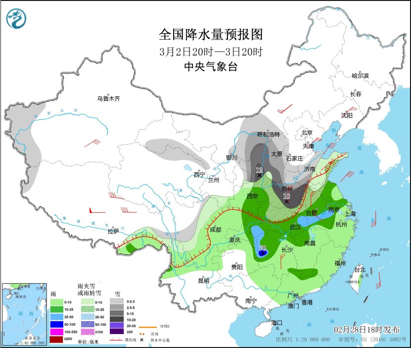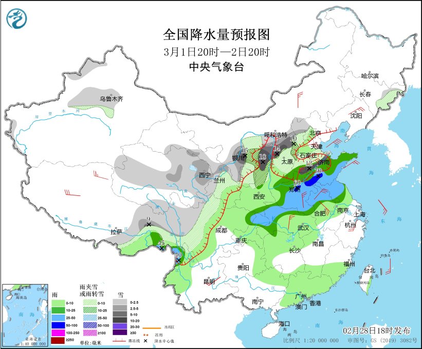 *3月1日20時至2日20時,*內蒙古河套地區、新疆沿天山地區、西藏東部、西北地區東北部和中部、華北中北部、黃淮東部、河南北部、西南地區北部等地部分地區有小到中雪或雨夾雪,其中,西藏東南部、內蒙古河套地區、寧夏中北部、陝西北部、山西中北部、山東西部等地部分地區有大到暴雪(10~15毫米)。西藏東南部、陝西東南部、黃淮大部、江淮大部、重慶東北部、雲南西北部等地部分地區有中到大雨,其中,河南中部、山東南部等地部分地區有暴雨(50~70毫米)。西藏北部、內蒙古中部、遼寧中部、山東、河南、安徽、湖北中部、浙江北部、雲南中東部等地部分地區有4~6級風;渤海、渤海海峽、黃海中北部、東海北部等海域有6~8級風(見圖6)。