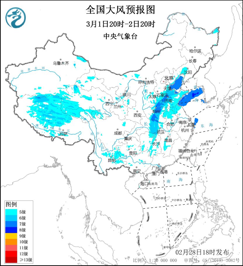 預計,3月1日20時至2日20時,東北地區南部、華北南部、黃淮、江淮北部、江漢以及雲南東部、西藏中北部、青海南部等地有4~6級風,陣風7~8級,其中,山東西部、河南中東部、河北南部、西藏中北部等地的部分地區有6~7級風,陣風9級左右。渤海、黃海中部海域、東海西北部的部分海域將有7~8級、陣風9級的大風(見圖3)。中央氣象台2月28日18時發佈大風藍色預警。
