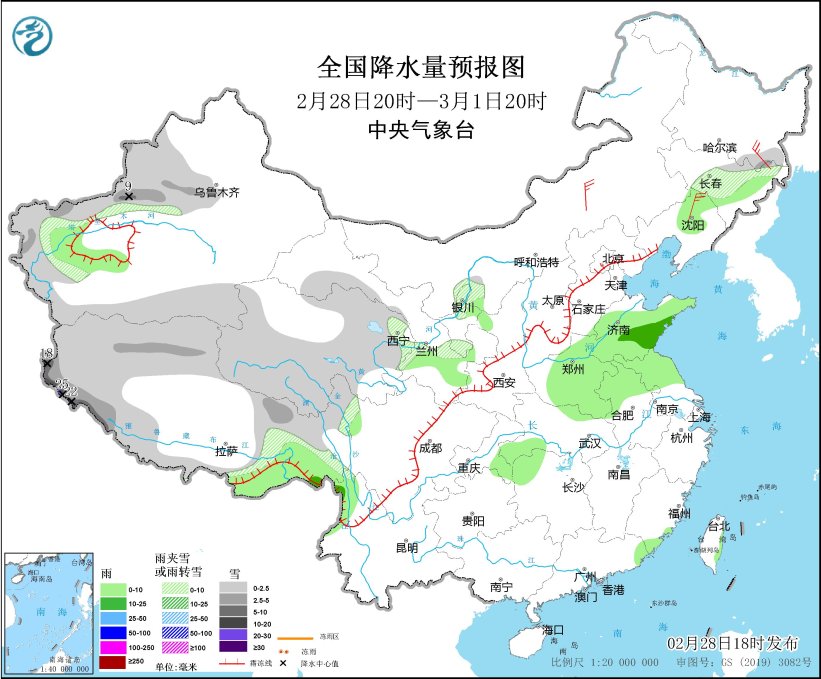 圖5 全國降水量預報圖(2月28日20時-3月1日20時)