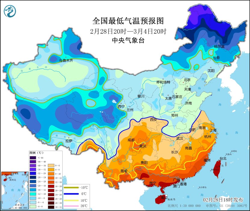 圖2 全國最低氣温預報圖(2月28日20時-3月4日20時)