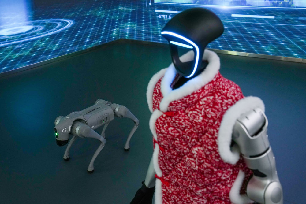在北京“機器人大世界”的應用場景示範區展出的宇樹公司的機器狗和機器人(2月24日攝)。新華社記者 鞠煥宗 攝