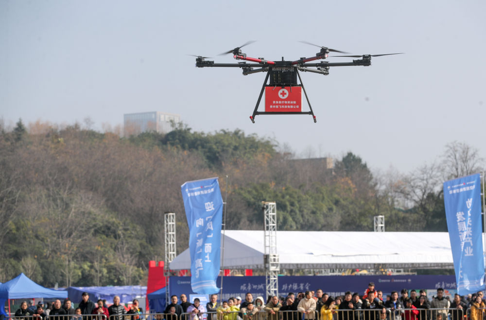 1月5日,在貴陽市觀山湖區民族大聯歡廣場,民用運載無人機在模擬救援場景中運送救援物資。新華社發(袁福洪 攝)