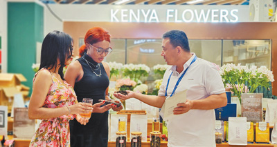 第三屆中非經貿博覽會期間,肯尼亞紫茶代理商(右一)向參展者介紹肯尼亞紫茶。