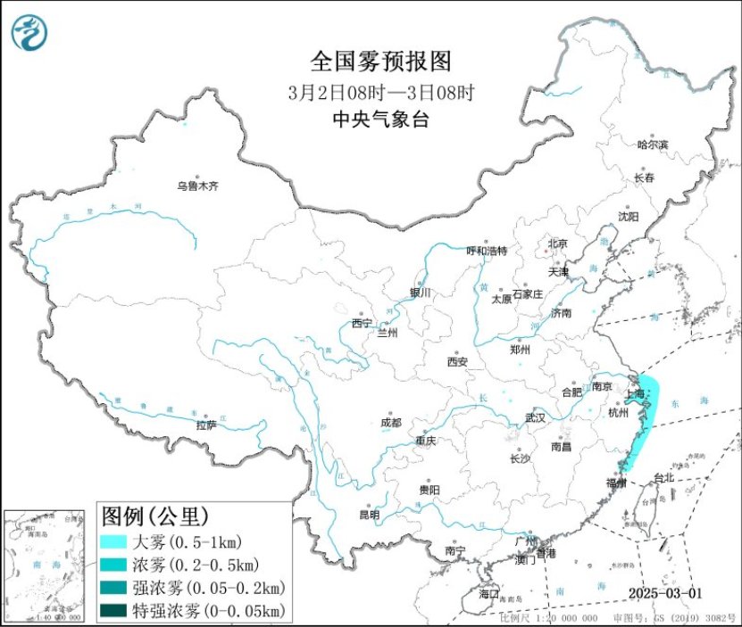 預計,3月2日白天至夜間,長江口及杭州灣附近海域、舟山羣島附近海域、浙江沿岸海域、上海港、寧波港將有能見度不足1公里的濃霧(見圖4)。中央氣象台3月2日06時繼續發佈大霧黃色預警*。*