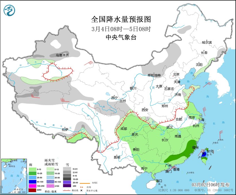 *3月3日08時至4日08時,*內蒙古西部、新疆伊犁河谷和南疆西部山區、西藏東南部、甘肅河西、西北地區東部、華北中西部和南部、黃淮大部、安徽北部、江漢東部和西部等地部分地區有小到中雪或雨夾雪,其中,陝西南部、山東中南部、河南東部和南部、安徽北部、湖北北部和西部等地部分地區有大到暴雪(10~12毫米)。江淮大部、江漢大部、江南、西南地區東部、華南、台灣島等地部分地區有小到中雨,其中,安徽南部、浙江南部、福建西北部等地部分地區有大雨(25~30毫米)。遼寧中部、新疆南疆盆地、天津中部、山東南部等地部分地區有4~6級風,其中,西藏北部部分地區有7~8級風(見圖6)。