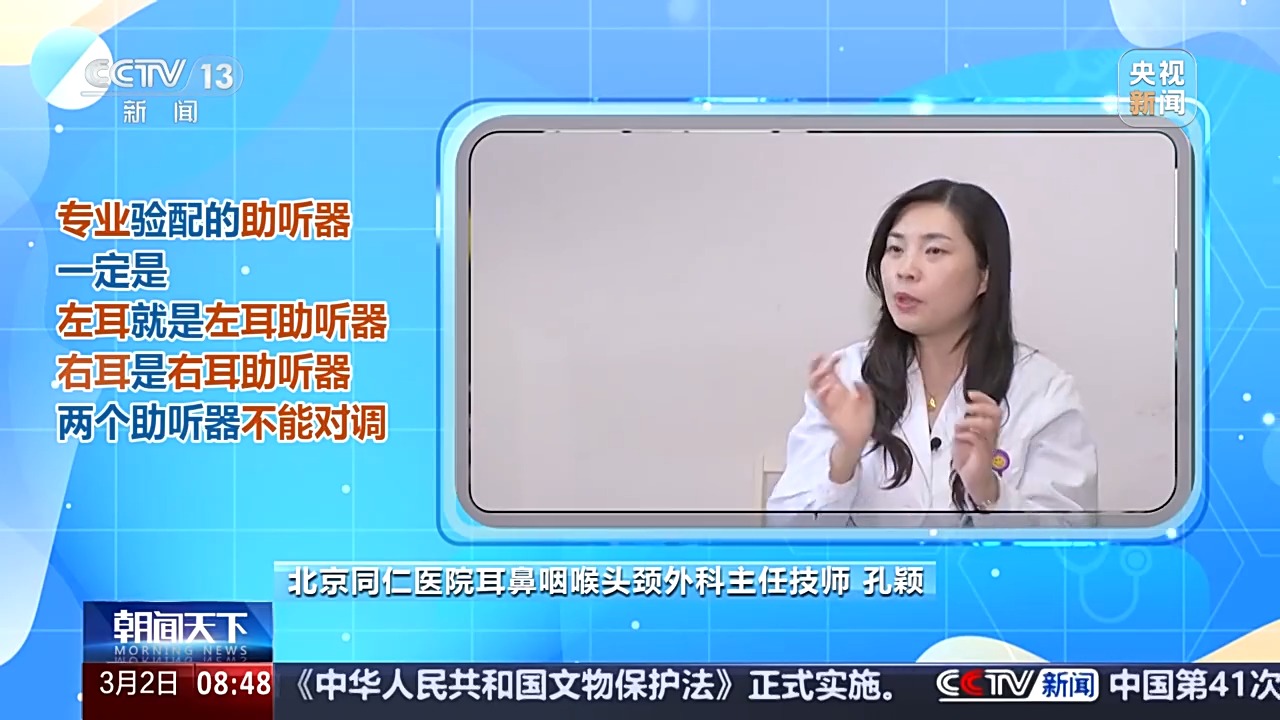 *北京同仁醫院耳鼻咽喉頭頸外科主任技師 孔穎:*正常的兩個耳朵聽力都不完全一樣,何況聽力損失的患者,我們真正專業驗配的助聽器一定是左耳,就是左耳助聽器,右耳是右耳助聽器。我們在跟患者講解的過程中告訴他,兩個助聽器是不能對調的。