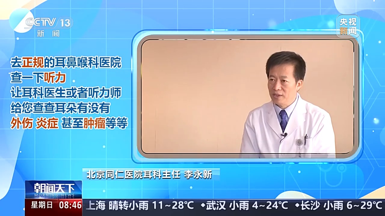 *北京同仁醫院耳科主任 李永新:*去正規的耳鼻喉科醫院查一下聽力,讓耳科醫生或者聽力師給您查查耳朵有沒有什麼外傷、炎症,甚至腫瘤等等,及時到醫院就診,及時干預,及時用藥,聽力康復的概率可能會加大。
