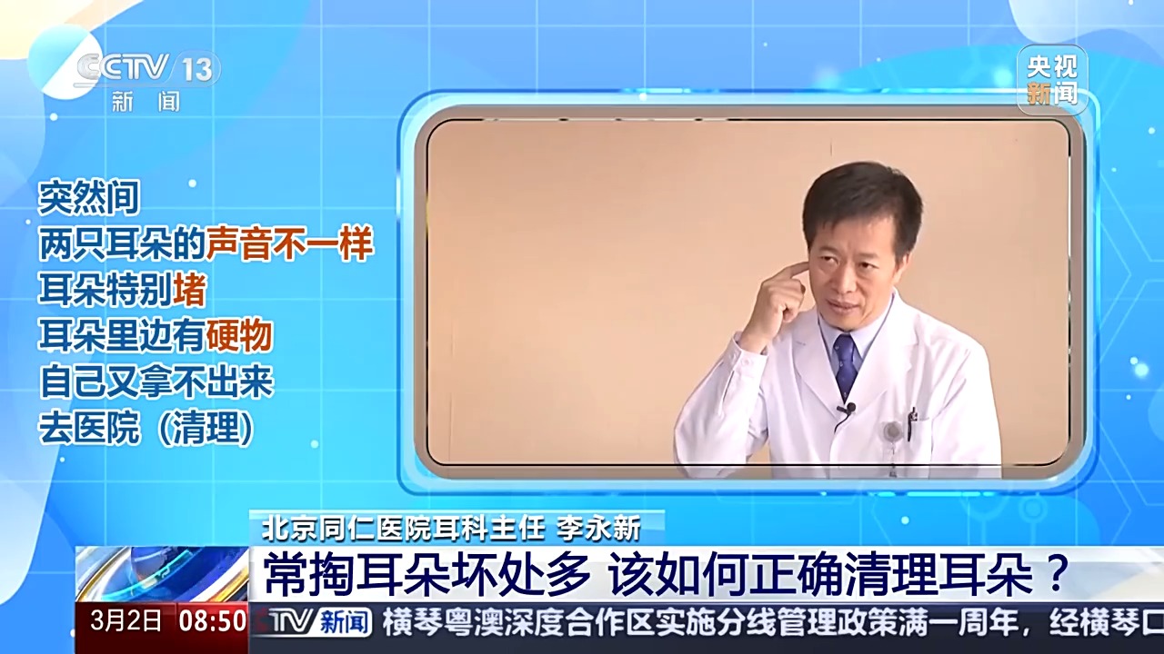 *北京同仁醫院耳科主任 李永新:*比方説我突然間覺得兩隻耳朵的聲音不一樣,我覺得這個耳朵特別堵,耳朵裏邊有個硬物,我自己又拿不出來,這時候你去醫院清理,而除此之外,兩邊聲音都可以,一般的耵聹你不用管它。尤其我們年輕人好動,吃東西也比較用力,你這活動咀嚼、下頜關節的運動,都會把這耵聹自動排出來,不要特別干預它。