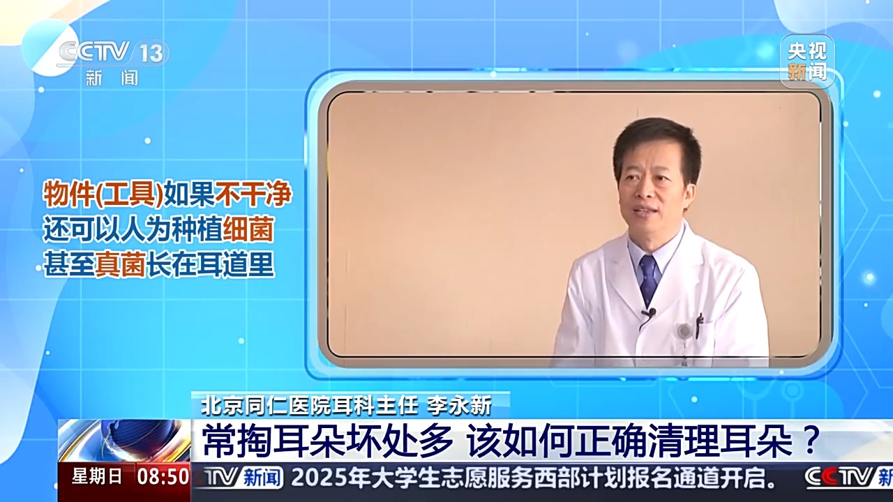 *北京同仁醫院耳科主任 李永新:*每個人的耳道口都有一圈耵聹在附着着,那是耵聹腺分泌的一種物質。這個物質它有保護作用。同時耵聹還有殺菌的作用,我們上耳道的皮膚都有紋理血管,那麼你經常掏會導致皮膚血管的增生,讓通透性下降,容易患病。當然你掏的物件如果不乾淨,還可以人為種植細菌,甚至真菌長在你的耳道里,所以清理相應有一個度,過度肯定不對。