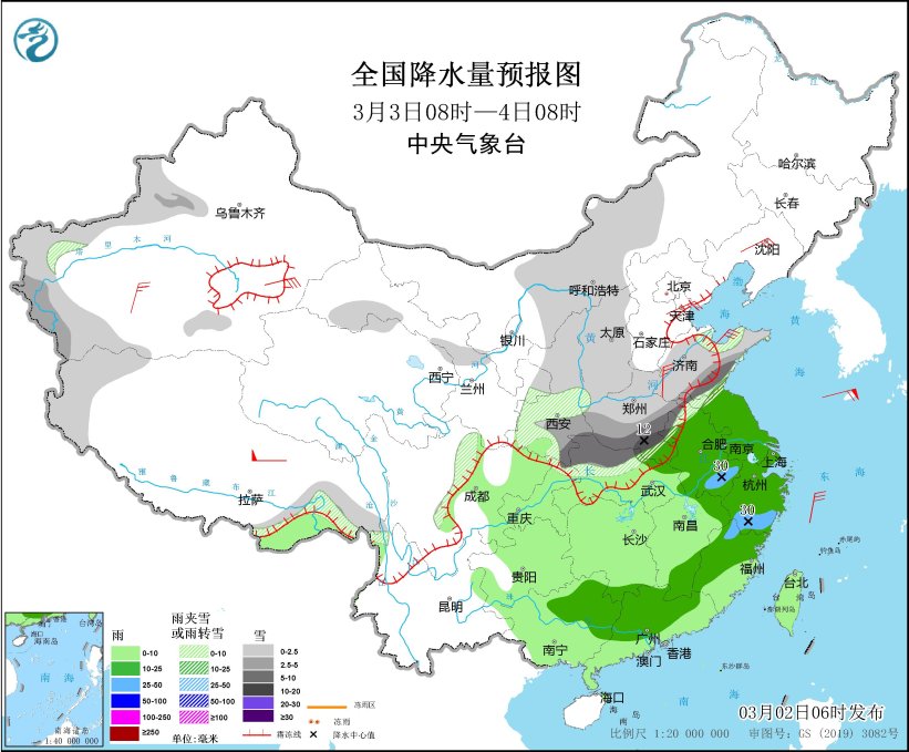 雨雪方面,預計2日至3日,西北地區東部、華北西部和南部、黃淮、江漢等地有小雨轉雨夾雪或中到大雪,陝西、河南、山東、湖北北部等地部分地區有暴雪;上述部分地區新增積雪深度4~8釐米,局地10釐米以上。此外,黃淮、江漢、江淮、江南西部和北部等地部分地區有大雨,局地暴雨,並伴有雷暴大風或冰雹等強對流天氣。